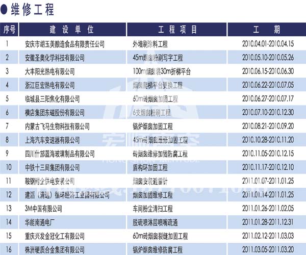 宏順建設(shè)工程有限公司是國(guó)家批準(zhǔn)成立的專(zhuān)業(yè)高空作業(yè)企業(yè):承攬過(guò)(國(guó)內(nèi).國(guó)外)煙囪新建、煙囪防腐、吊機(jī)防腐、水塔防腐、管道防腐、龍門(mén)吊防腐、儲(chǔ)存罐防腐、煙囪內(nèi)壁防腐等高空作業(yè)工程。具有“不搭腳手架 、 不需要停產(chǎn)”施工特點(diǎn)。